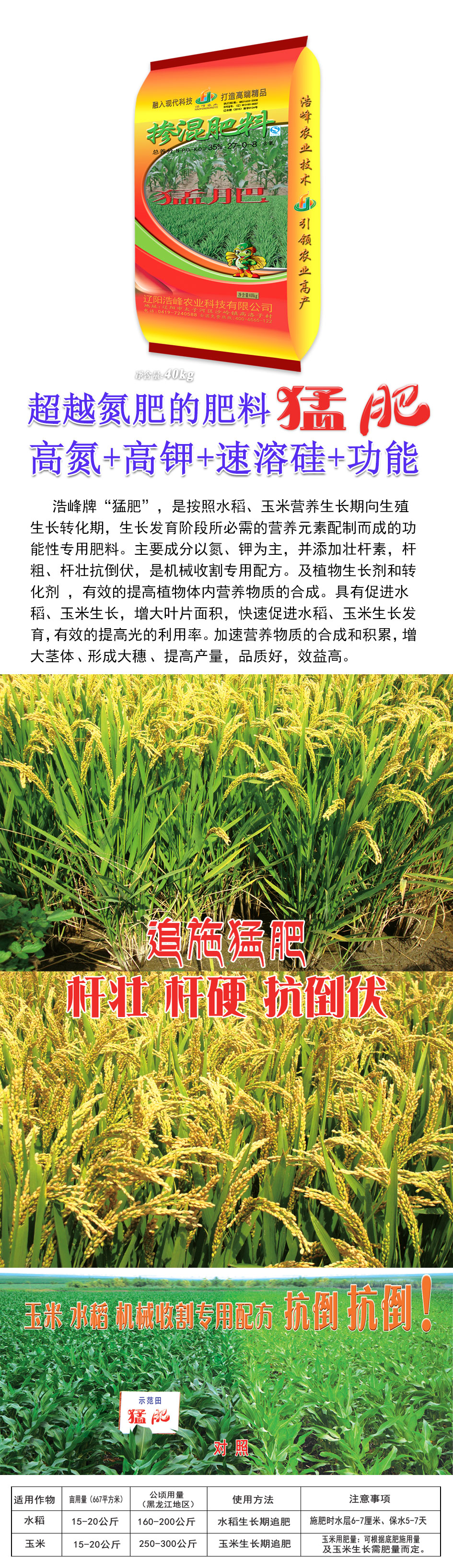 浩峰牌“猛肥”,是按照水稻、玉米營(yíng)養(yǎng)生長(zhǎng)期向生殖生長(zhǎng)轉(zhuǎn)化期,生長(zhǎng)發(fā)育階段所必需的營(yíng)養(yǎng)元素配制而成的功能性專(zhuān)用肥料。主要成分以氮、鉀為主,并添加壯桿素,桿粗、桿壯抗倒伏,是機(jī)械收割專(zhuān)用配方。及植物生長(zhǎng)劑和轉(zhuǎn)化劑 ,有效的提高植物體內(nèi)營(yíng)養(yǎng)物質(zhì)的合成。具有促進(jìn)水稻、玉米生長(zhǎng),增大葉片面積,快速促進(jìn)水稻、玉米生長(zhǎng)發(fā)育,有效的提高光的利用率。加速營(yíng)養(yǎng)物質(zhì)的合成和積累,增大莖體、形成大穗、提高產(chǎn)量,品質(zhì)好,效益高。